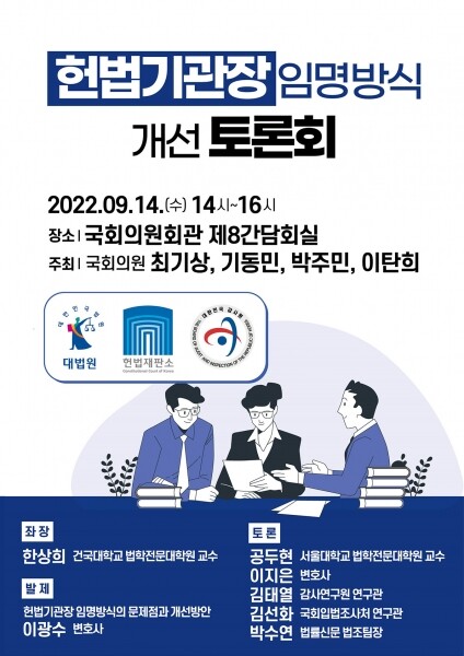 토론회 좌장은 한상희 교수가 맡았으며 이광수 변호사가 ‘헌법기관장 임명방식의 문제점과 개선방안’이라는 주제로 발제할 예정이다.
