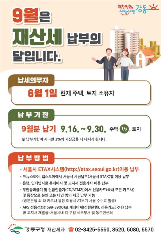 재산세는 과세기준일 현재 소유자를 대상으로 매년 7월과 9월에 부과되는데, 7월에는 주택, 건축물, 선박이 납부 대상이었고 이번 9월은 나머지 주택과 토지가 납부대상이다.