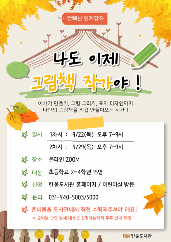 이와 연계한 독서 프로그램 ‘나도 이제 그림책 작가야’ 강좌가 오는 22일과 29일에 운영되는데, 초등학교 2~4학년 학생 15명을 모집해 오후 7시부터 9시까지 ZOOM을 통해 비대면으로 진행될 예정이다.