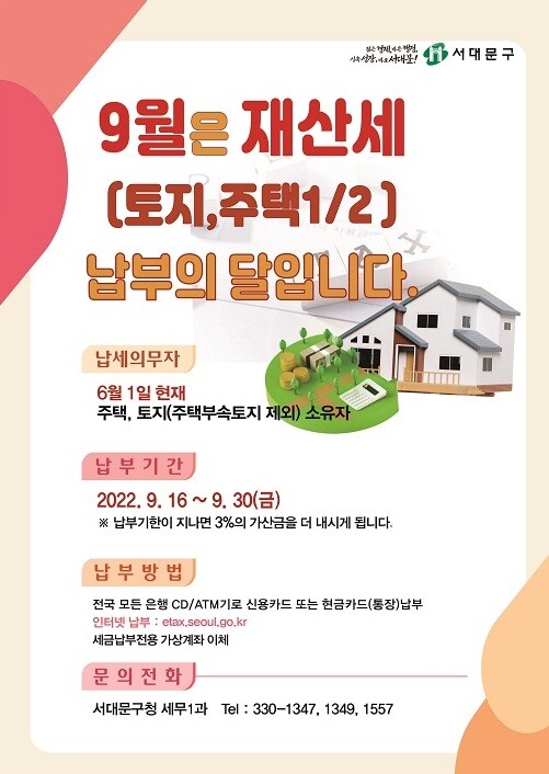 서대문구의 이번 9월 정기분 재산세 부과 규모는 139,658건에 825억 8천만원으로 구는 지난주까지 고지서를 일제히 발송했다.