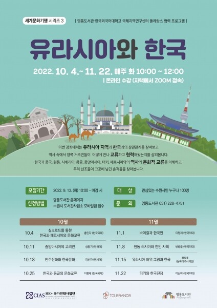 ‘유라시아와 한국’은 수원시 영통도서관이 한국외국어대학교 국제지역연구센터 똘레랑스와 협력한 세계문화기행 시리즈의 세 번째다.