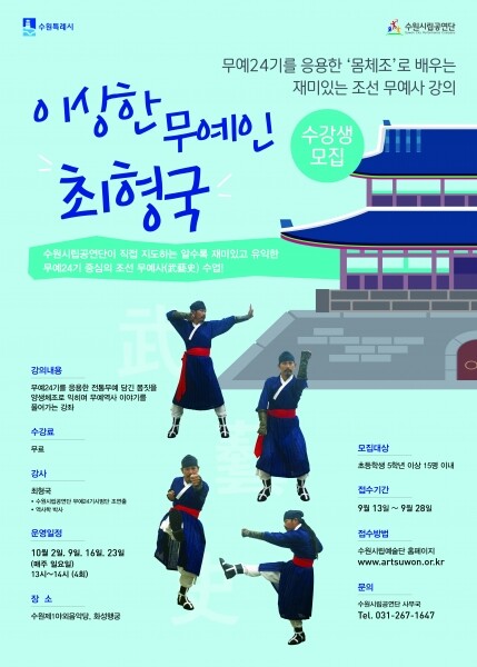 무예24기를 응용한 '몸체조'로 배우는 재미있는 조선 무예사 강의 ‘이상한 무예인 최형국’은 10월 2일부터 10월 23일까지 4회에 걸쳐 매주 일요일 수원제1야외음악당에서 진행한다.
