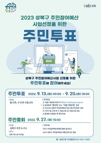 투표결과는 9월 27일 성북구청에서 개최되는 주민참여예산 주민총회에서 발표하며 선정된 사업은 의회 의결을 거쳐 2023년 성북구 주민참여예산으로 확정된다.