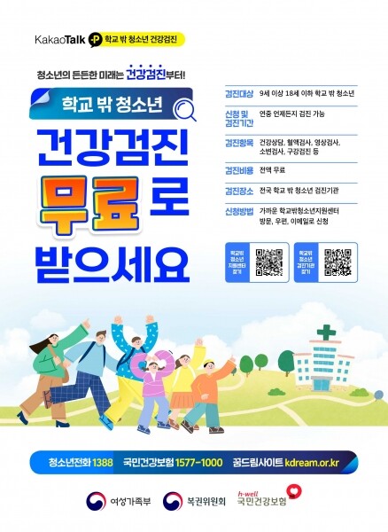 여성가족부, 국민건강보험공단과 함께 학교 밖 청소년의 건강 관리와 질병 조기 발견 및 예방을 위해 지원하는 사업으로 만 9세 이상 18세 이하 학교 밖 청소년이라면 누구나 무료로 3년에 한 번씩 건강검진을 받을 수 있다.