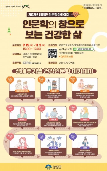 이번 인문학 아카데미는 오는 9월 15일부터 11월 3일까지 총 9회 과정으로 회차별 오후 3시부터 5시까지 운영되며 9월 15일 소아호흡기 관리 9월 22일 소아청소년기 키 성장 9월 29일 비건 생활/건강한 식습관 형성 10월 6일 환경성 질환/알러지비염, 급성기관지염 10월 12일 만성질환 관리/당뇨 10월 19일 근골격계질환 10월 26일 구강 건강 11월 2일 치매 예방/대처법 11월 3일 정신건강/우울증의 주제로 각 과정은 군민 건강을 위협하는 주요 질병을 생애주기별로 구분해 진행된다.