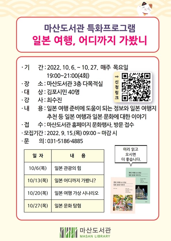 1주차는 ‘일본 관광의 힘’, 2주차는 ‘일본 어디까지 가봤니?’, 3주차는 ‘일본 여행 가상 시나리오’, 4주차는 ‘일본 문화 탐험’으로 구성되며 자세한 내용은 마산도서관 홈페이지 문화행사 신청에서 확인할 수 있다.