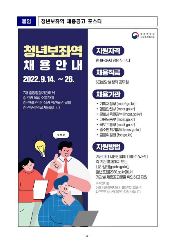 장관이 공석인 교육부·보건복지부는 장관 취임 후 청년보좌역 채용절차 진행 예정 청년보좌역 제도는 국정 전반에 청년세대의 인식을 반영할 수 있는 통로를 마련하고 청년이 직접 정책 과정에 참여할 수 있도록 한다는 윤석열 정부의 국정과제이다.