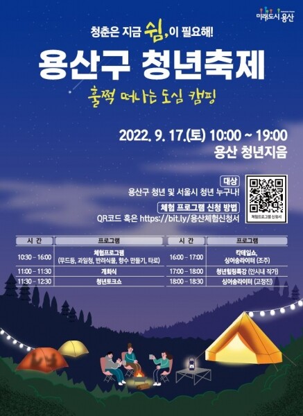 박희영 용산구청장은 “이번 축제는 일상에 지친 청년들이 잠시 쉬어가는 소통의 장이 될 것”이며 “앞으로도 청년들의 이야기에 관심을 가지고 실질적인 도움이 되는 청년정책 마련을 위해 힘쓰겠다”고 말했다.