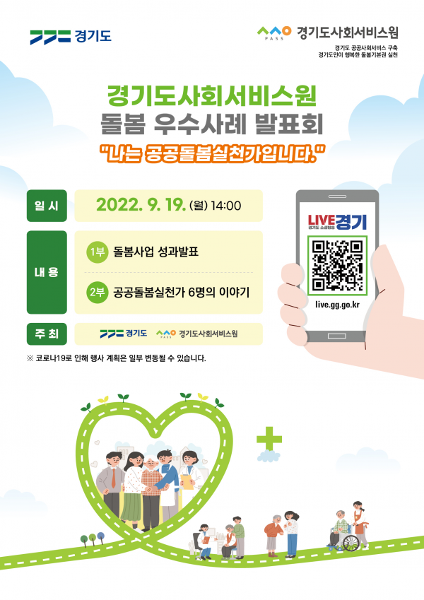 ‘나는 공공돌봄 실천가이다’를 주제로 열리는 이번 발표회는 경기도사회서비스원 소속기관의 돌봄서비스 제공 3주년을 기념해 마련됐으며 오프라인과 온라인 경기라이브 생중계로 동시 진행한다.