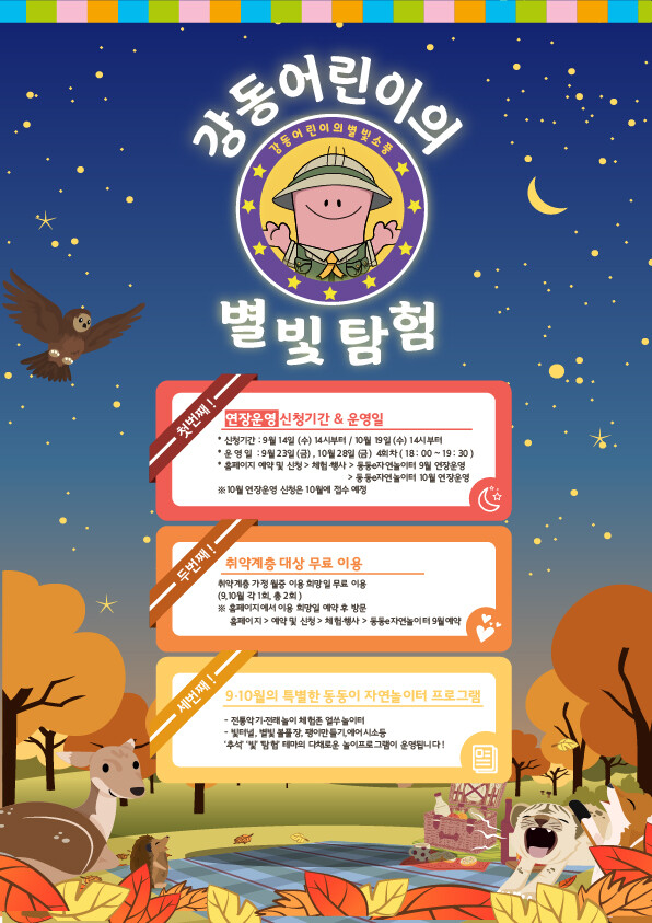 야간 이용 신청 접수는 9월 14일 오후 2시부터 강동어린이회관 홈페이지에서 선착순으로 신청을 받는다.