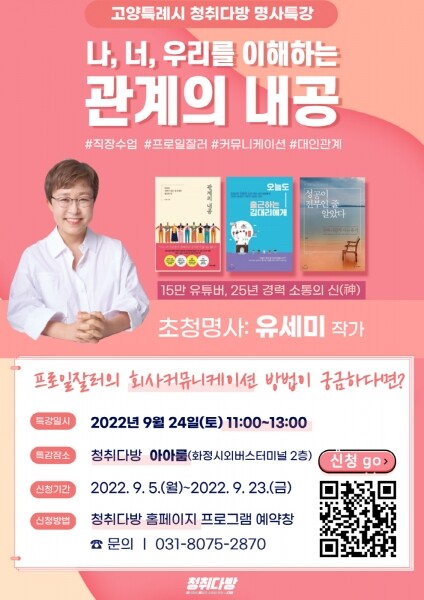 고양시 청년공간 청취다방이 주관하는 이번 명사특강은 삼성물산, 애경그룹에서 25년간 직장생활을 하며 다양한 유형의 사람들과 관계를 지혜롭게 맺어 온 유세미 작가를 초청해 진행된다.
