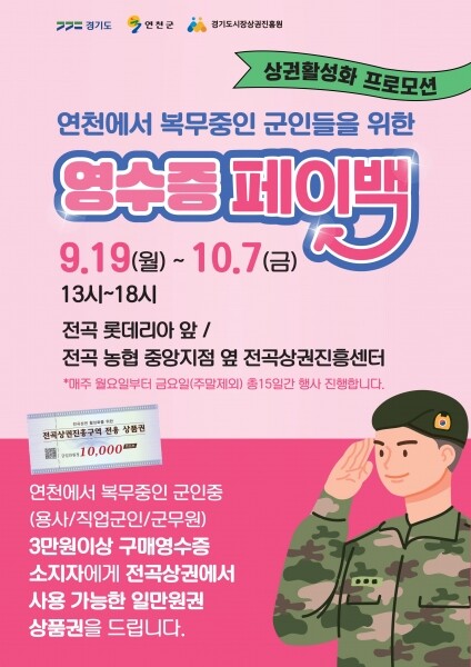 군은 오는 19일부터 10월 7일까지 3주간 군장병, 직업군인, 군무원을 대상으로 한 전곡상권진흥구역 상권 활성화 프로모션을 통해 전곡상권에서 사용 가능한 전용상품권 1만원권 약 5000장을 지급한다.