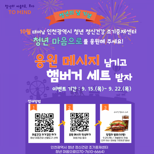 10월 말 개소 예정인 청년 정신건강 조기중재센터 ‘청년 마음으로’를 홍보하고 청년의 마음건강 자기관리를 지원하기 위해 마련한 이벤트는 청년 마음건강 자가검진 개소 응원 메시지로 구성했다.