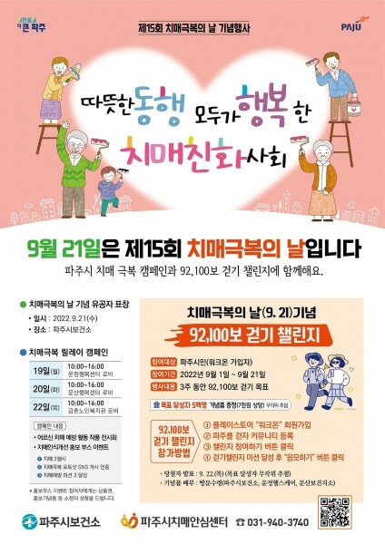 임미숙 파주시보건소장은 “제15회 치매극복의 날 캠페인을 통해 치매에 대한 부정적인 인식을 개선하고 치매 친화적 분위기 조성하고자 한다”며 “적극적인 치매 극복 활동에 보다 많은 파주시민이 함께 하기를 기대한다”고 말했다.