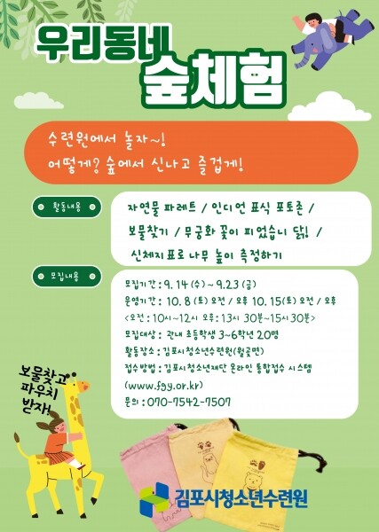 김포시청소년수련원장은 “수련원의 다채로운 숲 자원을 활용한 ‘우리 동네 숲 체험’ 프로그램을 통해 청소년들이 자연과 가까워지는 경험을 하며 생태감수성이 풍부해지길 바란다”고 전했다.