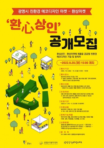 환상마켓 판매 부스에 입점해 에코디자인 제품을 판매할 ‘환심상인’의 모집 대상은 친환경 에코디자인 또는 에코콘텐츠 분야의 유통단계 제품을 보유한 7년 미만 창업 기업 또는 창작자이며 광명시에 주소지를 둔 기업 또는 개인은 우대한다.