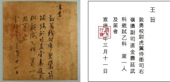 김수연 왕지는 1434년 3월 11일에 “돈용교위 호익시위사 우진 섭부사직 김수연”이 무과 친시에 “을과 제1인”으로 급제해 발급받은 홍패이다.