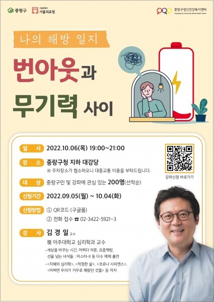 중랑구민 혹은 강연에 관심 있는 누구나 참여할 수 있으며 10월 4일까지 QR코드나 전화를 통해 신청하면 된다.