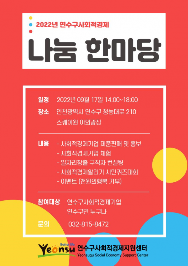 또한 행사 수익금은 사회적 취약계층 지원을 위해 기부될 예정이며 기타 자세한 사항은 연수구 사회적경제지원센터로 문의하면 된다.