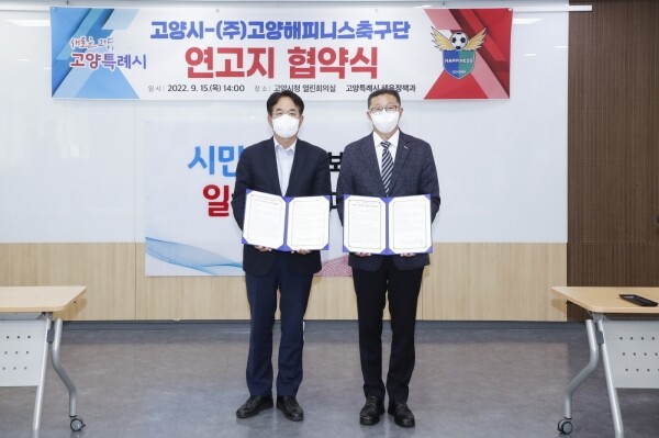 이날 협약식에 이동환 고양특례시장을 비롯한 시 관계자, ㈜고양해피니스 여승철 대표이사와 구단관계자와 이용제 후원회장, 고양해피니스 홍보대사인 독고영재 등이 참석해 고양시 축구발전 방안을 논의했다.
