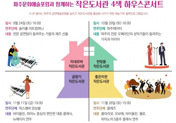 이번 진행되는 ‘4색 하우스콘서트’는 도서관마다 재즈, 가곡과 오페라, 뉴에이지, 클래식 등 악기와 음색을 달리하는 연주회로 파주시 작은도서관을 활성화하고 파주의 공연예술문화를 널리 알리기 위해 기획됐다.