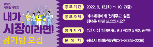 이번 공모는 평택시민, 관내 직장인 및 학생, 시 공무원을 대상으로 하며 “미래세대에게 전해주고 싶은 평택은 어떤 모습인가요?”에 대한 제안서를 작성해 4인 이상이 팀을 이루어 신청하면 된다.