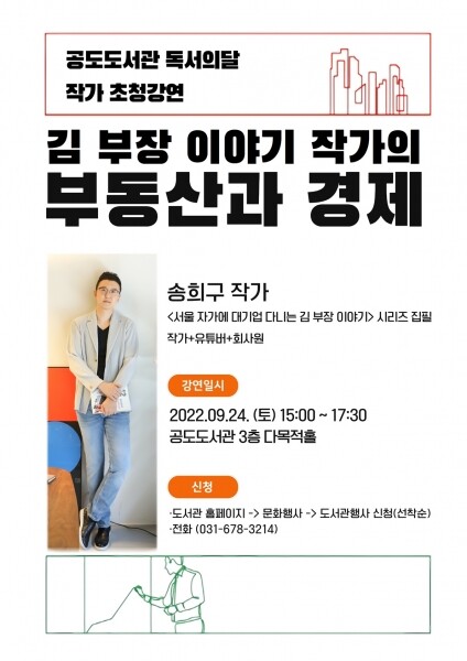 초청 저자는 ‘서울 자가에 대기업 다니는 김 부장 이야기’ 송희구 작가와 ‘회색인간’ 김동식 작가이며 모두 공도도서관 다목적홀에서 개최된다.