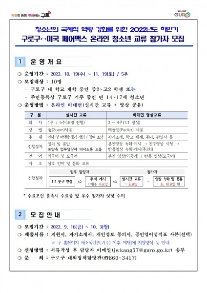구로구는 “청소년의 글로벌 역량 강화와 국제교류 참여 기회를 제공하기 위해 청소년 교류 프로그램을 마련했다”며 “코로나19 재확산에 대비해 지난해에 이어 올 하반기 프로그램도 온라인으로 진행한다”고 16일 밝혔다.