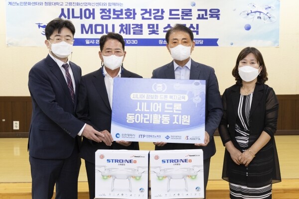 또한 같은 날 계산노인문화센터는 향후 원활한 드론교육을 위해 청운대학교 고령친화산업혁신센터와 업무협약을 체결하고 교육용 드론 11대를 기증받았다.