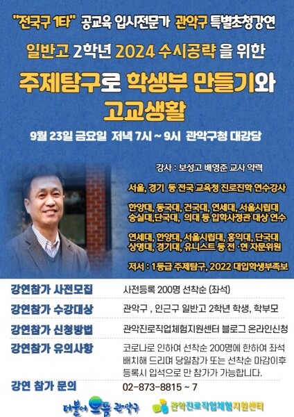 구는 오는 23일 오후 7시 관악구청 대강당에서 관내 일반고 2학년 학생 및 학부모를 대상으로 ‘2024. 대입수시공략, “주제탐구로 학생부 만들기와 고교생활”’ 강연을 연다.