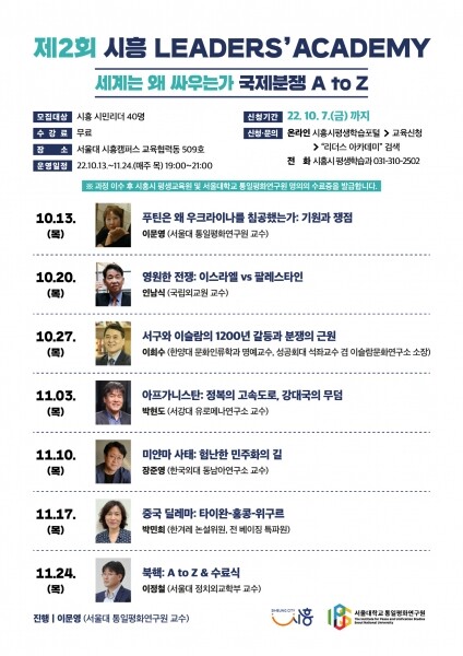 한편 시흥시는 2021년부터 서울대학교 통일평화연구원과 함께 ‘시민평화학교’, ‘시흥 리더스 아카데미’를 운영 중이다.