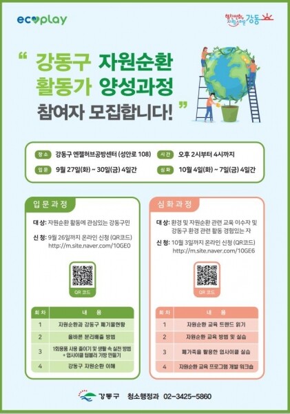 자원순환에 관심이 많고 적극적으로 참여 가능한 강동구민이면 누구나 신청 가능하며 입문반 30명, 심화반 30명으로 각각 모집한다.