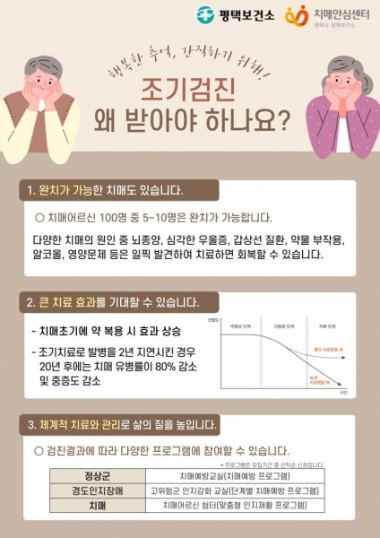 아울러 평택치매안심센터는 치매조기검진 치매치료관리비 지원 배회가능 어르신 인식표 제공 치매인식개선 교육 및 홍보 치매환자 맞춤형 사례관리 치매환자의 상태에 따라 위생용품 제공 등 다양한 사업을 추진하며 시민 건강관리에 힘쓰고 있다.