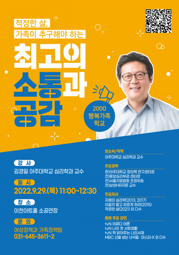 이날 강연은 1부 강연과 2부 Q&A 시간으로 진행되며 2부 시간에 강연자에게 물어보고 싶은 가족 간 소통, 갈등, 역할 등의 질문을 이천시청 홈페이지 배너 또는 QR링크를 통해 사전에 받고 있다.