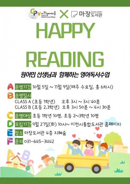도서관 관계자는 “원어민 선생님과 영어 공부를 할 기회가 없는 지역 초등학생들에게 이천영어마을과 협력해 영어 독서 프로그램을 운영함으로써 학부모들의 사교육비 부담을 줄이고 소외계층에게도 배움의 기회를 제공하는 유익한 시간이 될 것으로 기대된다”고 전했다.