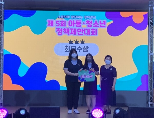 심사는 정책분석 창의성 실효성 사회적 파급력 발표력 다섯 개 기준을 100점 만점으로 아동친화도시추진위원 등 관련 전문가 4명이 참가 팀의 발표를 보며 평가했다.