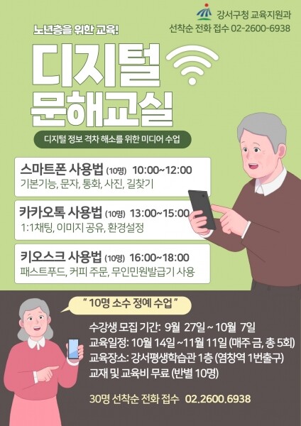 디지털 기기 사용에 어려움을 겪는 어르신이면 누구나 신청할 수 있으며 오는 9월 27일부터 강서구청 교육지원과에 전화로 신청하면 된다.