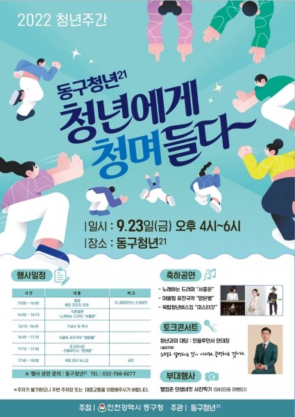 구 관계자는 “청년들이 직접 참여하고 주도하는 이번 청년 행사를 통해 동구의 청년 공간인 동구청년21와 청년 문화가 활성화되길 기대한다”며 “행사를 통해 청년들에게 긍정적인 메시지를 전달되길 희망한다”고 말했다.