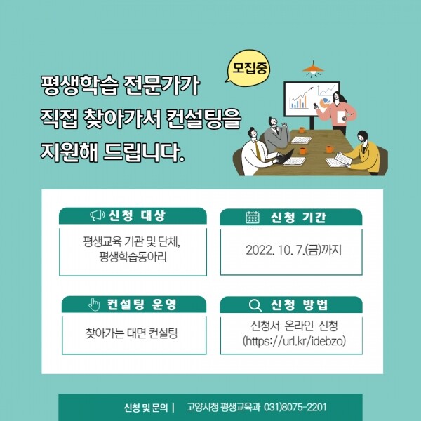 평생학습 컨설팅을 희망하는 평생교육 기관이나 단체, 평생학습 동아리는 10월 7일까지 온라인으로 신청하면 된다.