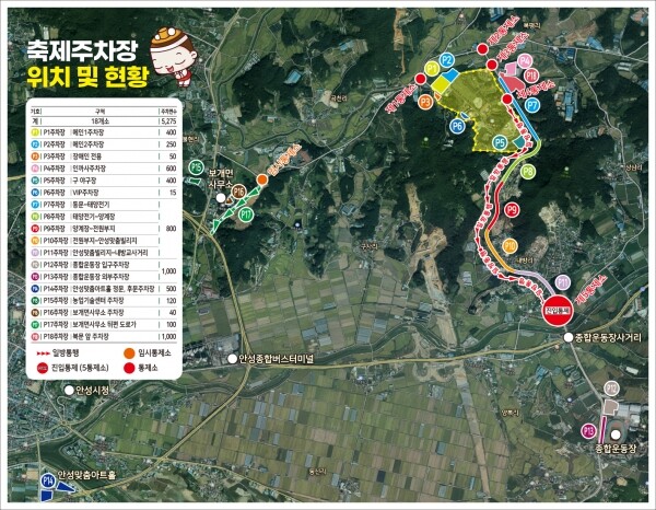 축제 주차장은 안성맞춤랜드를 비롯해 안성맞춤아트홀, 종합운동장 등 18곳에 마련됐으며 총 5,275개의 주차면수를 확보했다.