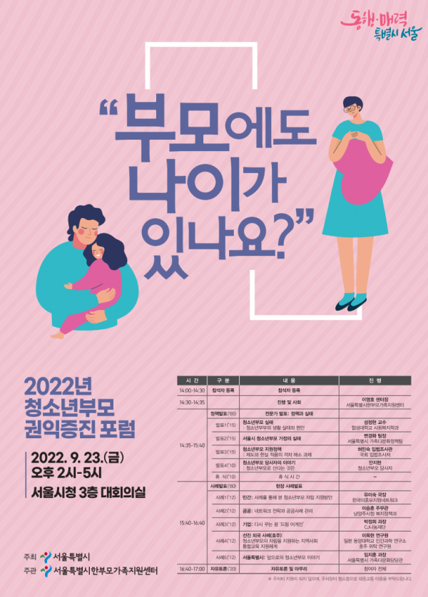 김선순 서울시 여성가족정책실장은 “이번 포럼이 그동안 정책 사각지대에 있던 청소년부모들을 체계적이고 지속적으로 지원하기 위한 정책과제를 발굴하는 뜻깊은 자리가 될 것으로 기대한다”며 “서울시는 어린 나이에 부모가 되어 양육·학업·취업을 병행하는 청소년부모가 안정적으로 자녀를 양육하고 사회·경제적으로 자립할 수 있도록 최선을 다해 지원하겠다”고 말했다.
