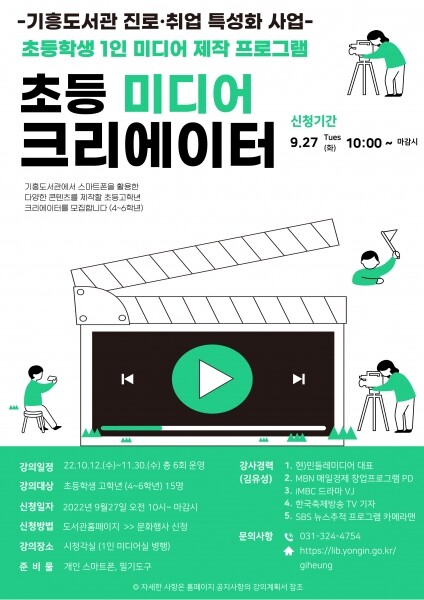 진로·취업 특성화 도서관인 기흥도서관은 미디어 크리에이터를 주제로 초등학생과 청년 대상의 미디어 제작 프로그램을 마련했다.