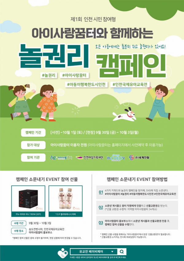 인천여성가족재단과 함께하는 이번 캠페인은 유아교육전을 찾는 방문객들에게 아이사랑꿈터를 알리고 아동들이 충분히 쉬고 맘껏 놀 수 있는 아동 놀 권리 인식 조성을 위해 마련됐다.
