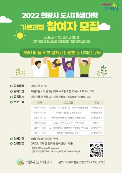 10월 5일 개강하는 ‘제6기 의왕시 도시재생대학 기본과정 프로그램’은 개편된 신규 도시재생사업에 대한 이해, 의왕시 부곡동 도시재생활성화지역에 대한 분석, 공동체 가치의 중요성 등 도시재생사업 추진과 밀접한 주제로 6회 차 수업을 진행한다.