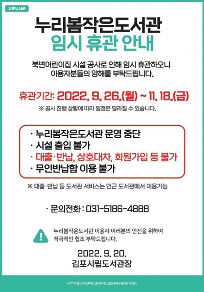 김포시 시립도서관장은 “이번 휴관으로 인해 누리봄 작은도서관 이용자들에게 불편이 예상되지만 공사기간 중 이용자의 안전을 위한 조치이오니 시민들의 양해와 협조를 부탁드린다”고 전했다.