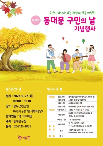 이필형 동대문구청장은 “청명한 가을 하늘 아래 모처럼 구민들이 모여 함께 할 수 있는 자리를 마련했다”며 “잠시 멈췄던 지난 2년여의 시간을 뒤로하고 이웃과 직접 만나 이야기를 나누고 기념식을 함께 즐기며 지역에 대한 애정과 자긍심을 높이는 기회가 되길 바란다”고 밝혔다.