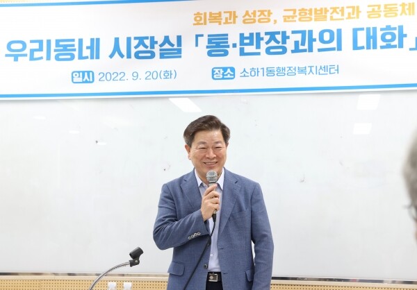 ‘시장이 찾아가는 우리동네 반상회’에서는 갈등을 해결하고 재난 발생과 기후변화 대응에 이르기까지 통장의 역할이 요구되는 가운데 통장의 역량을 강화해 나가는 방안에 대해 의견을 나눴다.