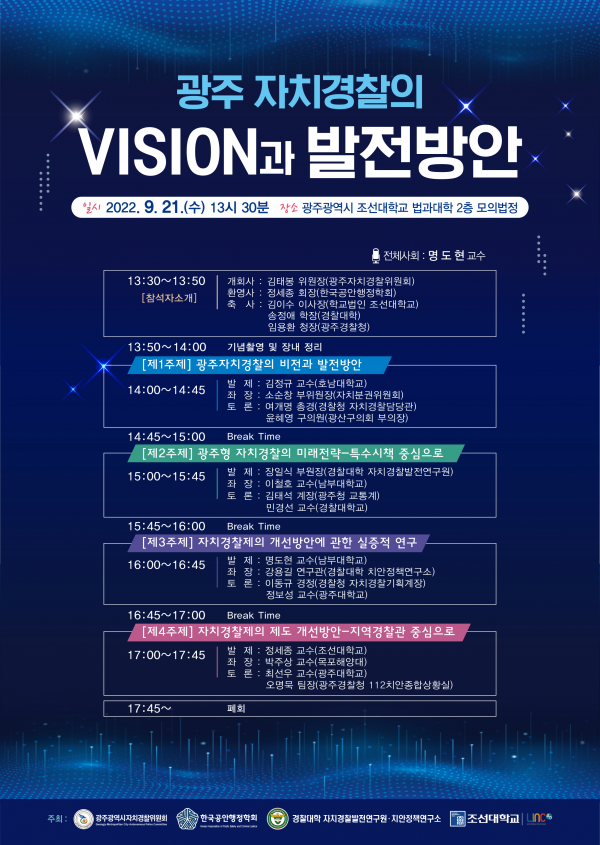 이번 학술대회는 광주자치경찰의 비전과 발전전략이라는 주제에 맞춰, 광주형 자치경찰 발전모델을 찾아내기 위해 깊이 있게 연구한 결과를 발표하면서 많은 관심이 집중되었는데, 경찰대학 자치경찰발전연구원이 주도적으로 협업 연구를 하면서 구체적인 성과를 거두고 있다.