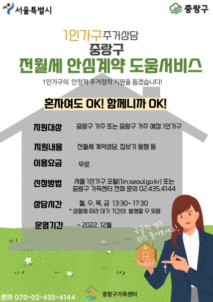 1인 가구를 위한 전월세 안심계약 도움서비스는 이달부터 12월까지 운영되며 상담이나 집 보기 동행 등은 사전 예약에 따라 주 4회, 화요일을 제외한 매주 평일 오후 1시 30분부터 5시 30분까지 진행된다.