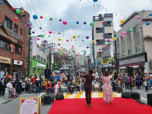 보도를 넓히고 화단형 벤치를 설치하는 등 광장형 상가거리로 조성했다.
